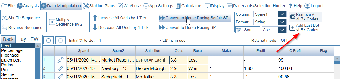 The Last Bet Code has been added to Staking Plans where it makes sense to use it. For more information read the Last Bet <LB> Code Help Section
