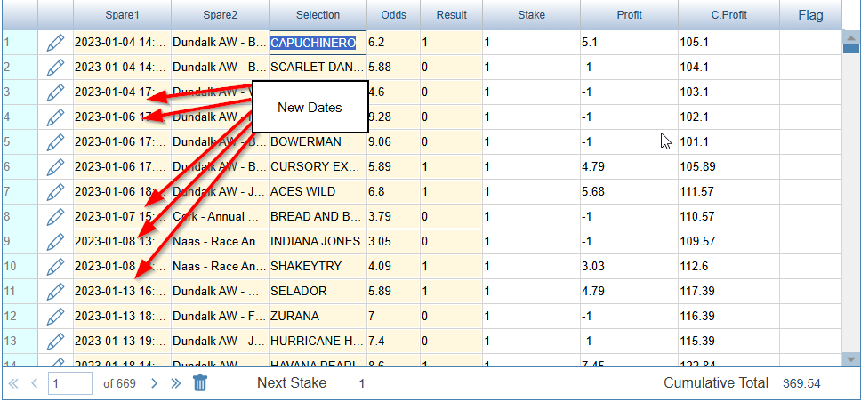In our example data below we have the date in the Spare 1 Column. We can see that at bet 11 a new day has begun. We want to add a Last Bet Code to Bet number 10.