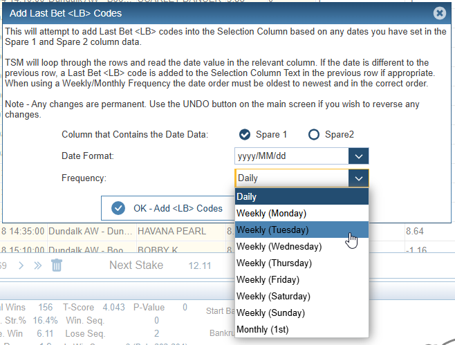 When using this feature, TSM can be asked to add Last Bet <LB> Codes automatically to the bet data. It does this by using any date data you already have stored in the Spare 1 and Spare 2 column. Whenever a new date is found in the next row, a <LB> code is added to the current row if appropriate.