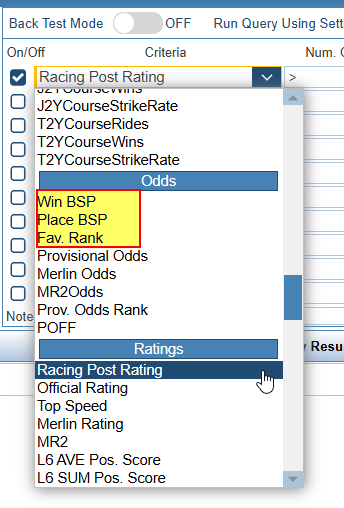 As of Version TSMapp V1.54 released on 1st July 2025, Win BSP, Place BSP and Fav. Rank are available to use as normal criteria options under the Odds Section. These filters will simply be ignored when running any Daily Queries (Not in Back Test Mode).