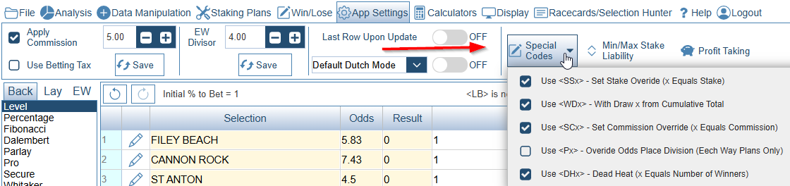 In the screenshot below <SC5> has been added to bet 2. You can see that 5% commission has been applied to that bet. Compare to Bet 1 which has the same odds but used the global commission setting of 2%.