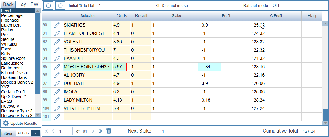 In the screenshot below <DH2> has been added to bet 95. You can see that the Profit has been reduced as per the standard Dead Heat Payout Rules. Commission is switched OFF to make the calculations easier to understand.