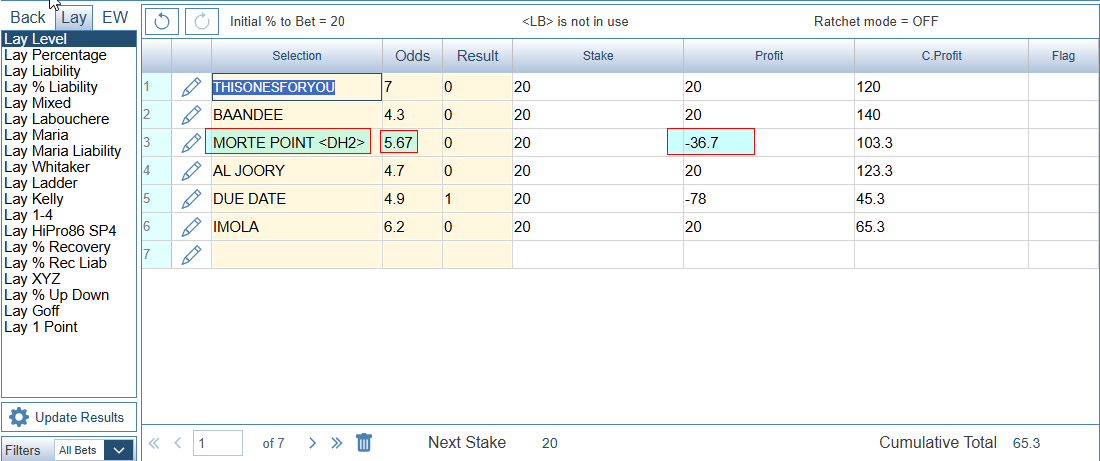 Lay Bet Dead Heat - In the screenshot below Bet 3 is Dead Heat but still shown as a winning bet. When there are 2 winners in a single winner race, the lay stake is halved. Half of the stake was a winning bet. And the other half lost.