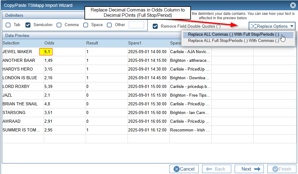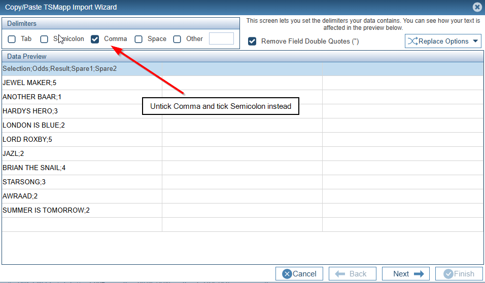 Press the Back Button until we get back to the initial Import Screen. Untick Comma and Tick Semicolon instead.