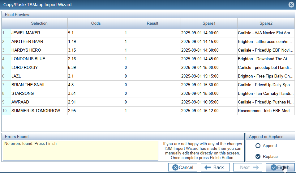 Press Finish to add the data to the Main Results Table.