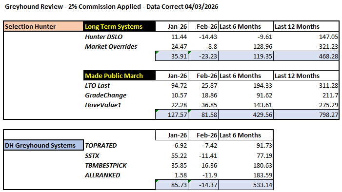 DH Racecards & Selections for Greyhounds have been available for over 6 months in TBM and since the start of the year in TSM. January showed some nice profits for SSTX and TBMBESTPICK where as Febuary was flat for all systems. Hopefully the better weather in March will bring the good results back. Long term over the last 6 months all 4 systems are showing a good profit.