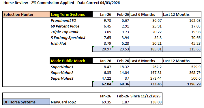 DH Racecards & Selections for Horses have been available since the start of the year. The top 2 Horses in the DH Racecard was almost 70 points up in Jan and breaking even in Febuary.