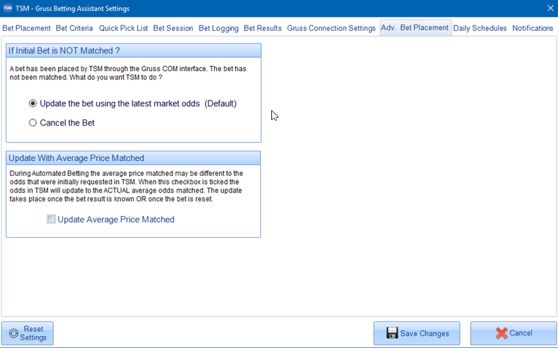 If Initial Bet is not matched ? - A bet has been placed by TSM through the Gruss COM interface. The bet has not been immediately matched. What do you want TSM to do ? Normally TSM will update the bet odds to the latest odds and the bet will be matched. However there is the option to cancel the bet and start again.