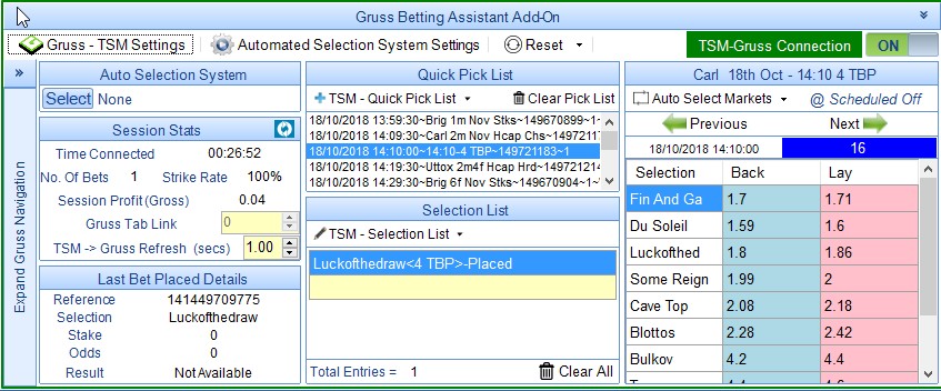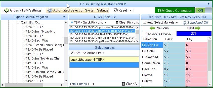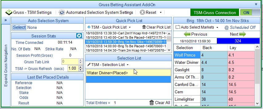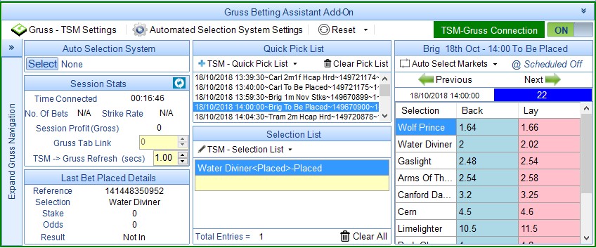 In the screenshot below I have added all UK and IRE Win and Place Markets to the Quick Pick List. All Win markets have a time offset of 30 seconds so that both Win and Place Markets are monitored by TSM.