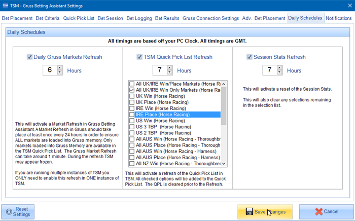 All timings are based off your PC Clock. All timings are GMT. All timings are based on a 24 hour clock. For instance in the screenshot above the Gruss Market Refresh is scheduled for 0600 hours whilst the TSM Quick Pick List Refresh and Session Stats Refresh is scheduled to run at 0700 hours GMT.