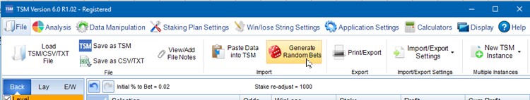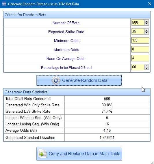 Each bet generated is treated individually. For instance if you have set the strike rate as 25% each bet has a 1 in 4 chance of being a win or a '1' as used in The Staking Machine. Therefore total wins will be different each time data is generated. |