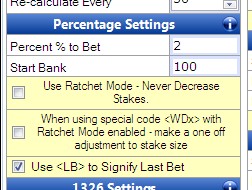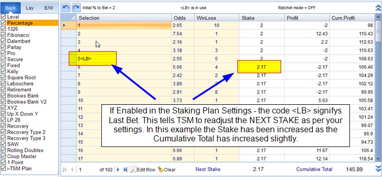 In the example below the 'Percentage' staking plan is selected and <LB> switched on. See how at Bet 6 the stake is readjusted to the cumulative total.