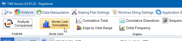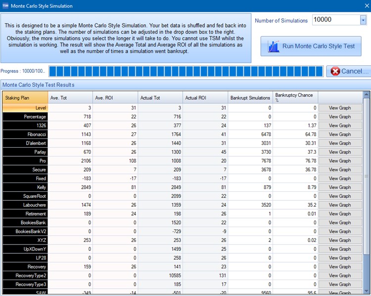 The Monte Carlo Simulations involves shuffling the data and checking the Cumulative Total and Bankruptcy Occurance for each shuffle. This is a great way of looking at the risk level associated with each staking plan. Press the Monte Carlo Simulation Button.