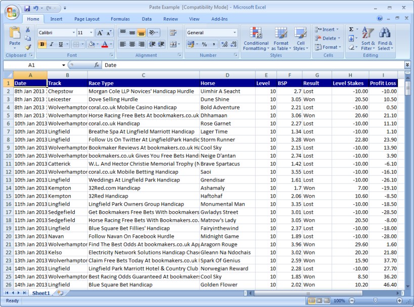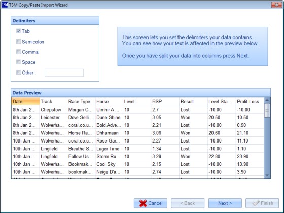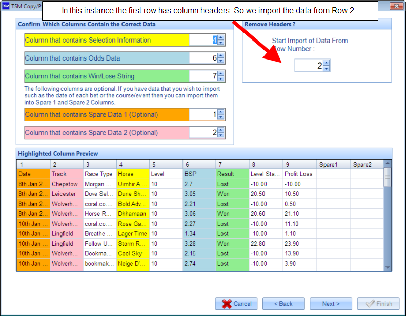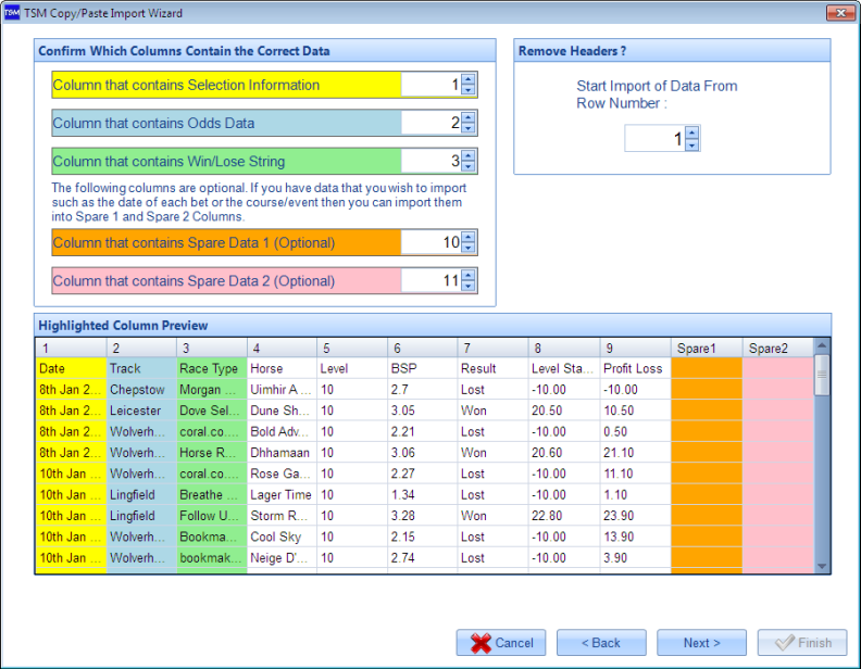 Make the necessary adjustments and we have the screen below. You can see that column 4 contains the bet selection data. Column 6 contains the odds data. Column 7 contains the bet result. The Spare Columns can be left empty. They are optional. But in this instance we will use the Track data and the Date. Notice also how the Start Import of data from Row Number is set to 2. This means that we miss out the first row containing headers.