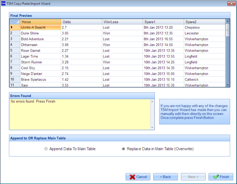 TSM validates the data for you. In the example above there are no errors. You can either append the data to the Master Table or Replace the Data in the Master Table. Once complete press the 'Finish' Button.