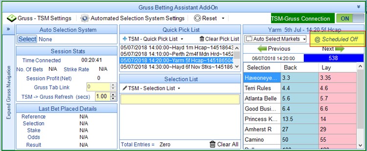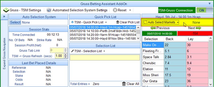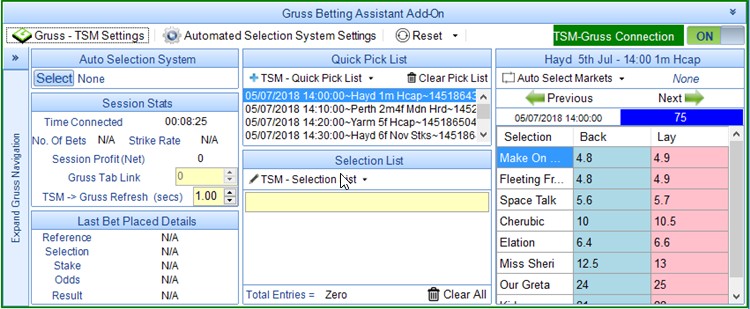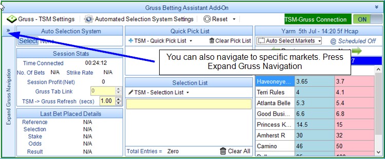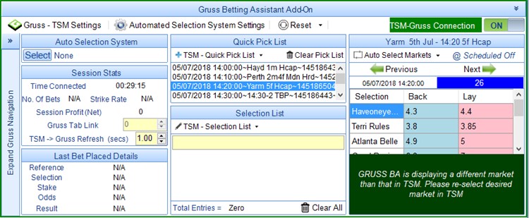 You can still use GRUSS BA to place your own separate bets. You MUST open up a NEW tab in Gruss BA and navigate to any market you desire in the NEW tab. By Default TSM links to the first TAB in Gruss. |