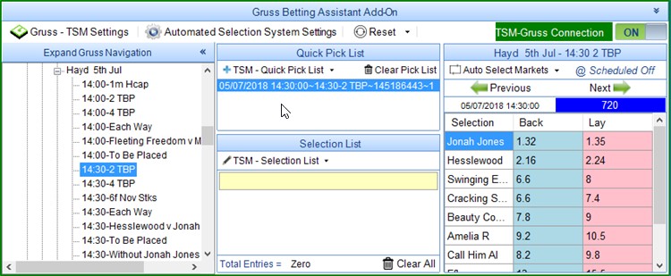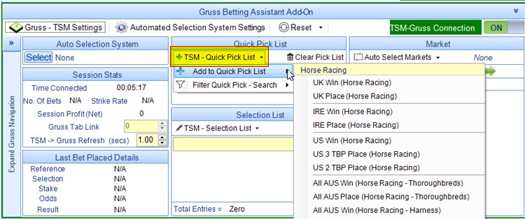 The Quick pick list originates from Gruss Betting Assistant. It is used to scroll through multiple markets. For instance all UK horse racing markets could be added to the "Quick Pick List". Once a race has finished, the next market on the "Quick Pick List" is shown. The Quick Pick List is populated by pressing the 'TSM - Quick Pick List' button and then from the drop down 'Add to Quick Pick List'. Various shortcuts are then available that will load markets into the Quick Pick List in time order.