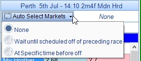 Wait Until Scheduled Off of Preceding Race - At the scheduled off the Next Market in the Quick Pick List will be selected. This has the effect of nicely looping through the days races.