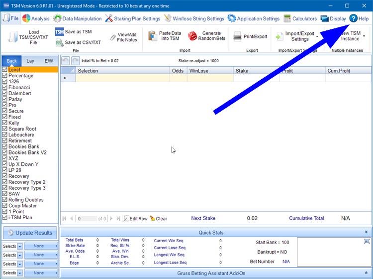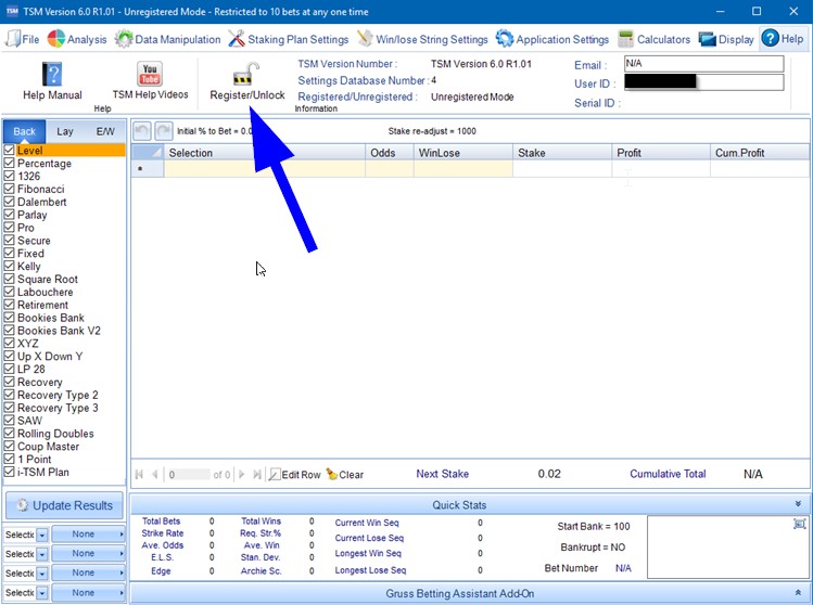 TSM Software will run in Evaluation Mode unless a license is purchased and used to unlock the software. The Evaluation Mode is restricted to using a maximum of 10 bets at any one time.