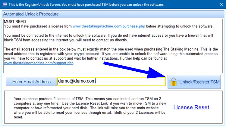 This brings up the Registration Screen. Enter your email and press 'Unlock/Register TSM'