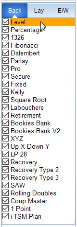 The Staking Plans in TSM are all shown on the main screen. You can Enable and Disable Staking Plans using the checkbox. This can be useful when dealing with very large amounts of data. Calculating results for 2-3 Staking Plans will clearly be faster than calculating all 17 Staking Plans.