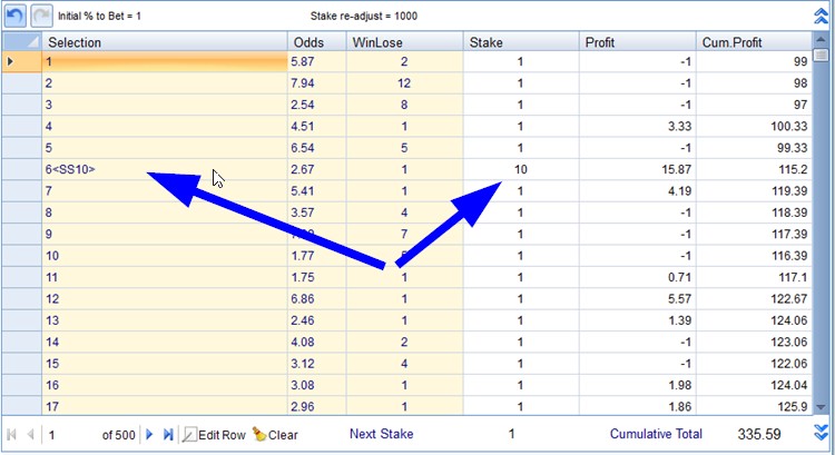 In the screenshot below <SS10> has been added to the selection column for bet 6. The stake has changed from 1 to 10 just for that bet.