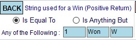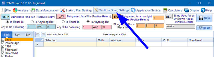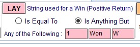 The settings above show that when looking at back staking plans the string '1' or 'Won' or 'W' is used to represent a win.