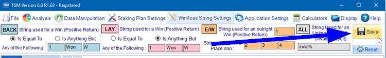 The last thing to look at is the 'String To Represent Awaits Result'. This can be set to anything you desire but must be different to all other strings that you have set. The default setting is 'awaits'. When you enter a bet into TSM but the result is not yet known then you should use the "Awaits Result" string. Some staking plans require the odds to be known before calculating the next stake. On these occasions you would use the "Awaits Result" string so that TSM can calculate the next stake.