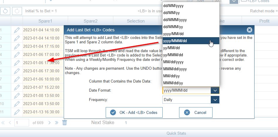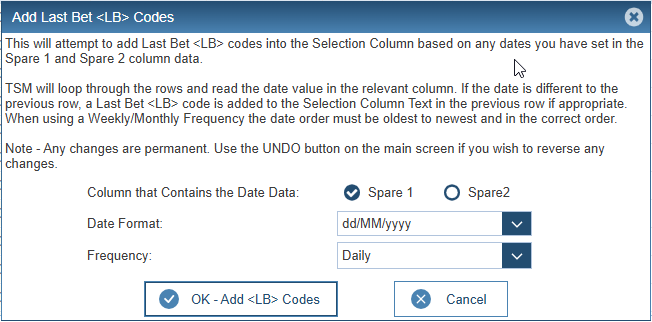 When using this feature, TSM can be asked to add Last Bet <LB> Codes automatically to the bet data. It does this by using any date data you already have stored in the Spare 1 and Spare 2 column. Whenever a new date is found in the next row, a <LB> code is added to the current row if appropriate.