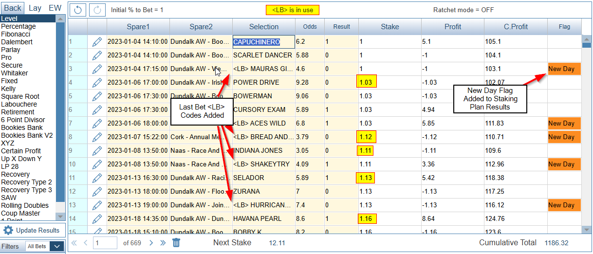 The Last Bet Code has been added to Staking Plans where it makes sense to use it. For more information read the Last Bet <LB> Code Help Section