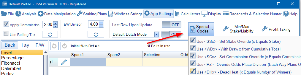 <Px> - Override Odds Place Division (Each Way Staking Plans Only) - When turned on TSM will check for the text of <Px> in the bet selection text. For example if you wished to use a divisor of 5 you would write <P5> along with your bet details in the bet selection column. This could be written as