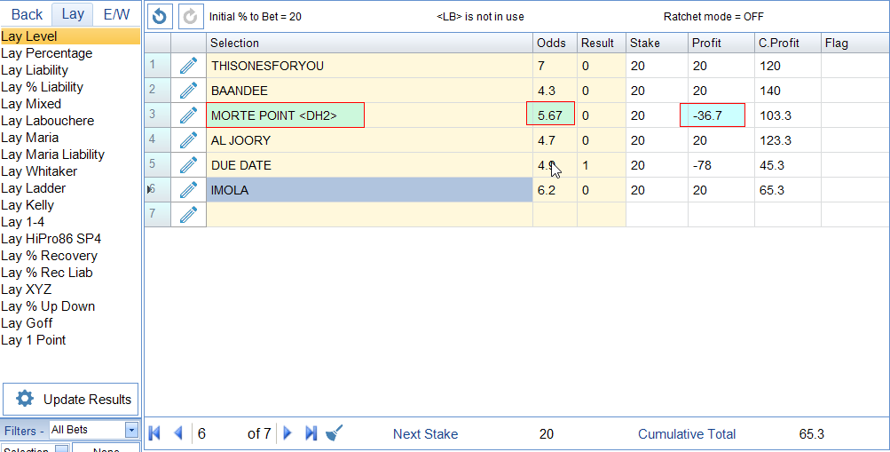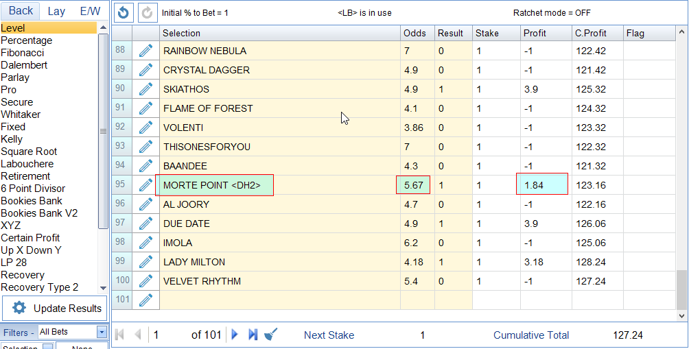 In the screenshot below <DH2> has been added to bet 95. You can see that the Profit has been reduced as per the standard Dead Heat Payout Rules. Commission is switched OFF to make the calculations easier to understand.