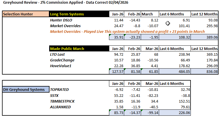 There are 3 additional systems that have been played live over the last 3 months and were made public for March.  These are LTO Last, GradeChange and HoveValue1. LTO Last had a great month again. Market Overrides has an odds limit of 3.5 BSP. Played live there were consistently more bets compared to Selection Hunter Historical Data. This is becuase we place bets at the scheduled off if they are within the odds range.  Nobody knows the BSP until the market is suspended. Played live Market Overrides had a profit of just over 23 points. For whatever reason there was a lot of greyhounds going off at under 3.5 and then the BSP being over 3.5.