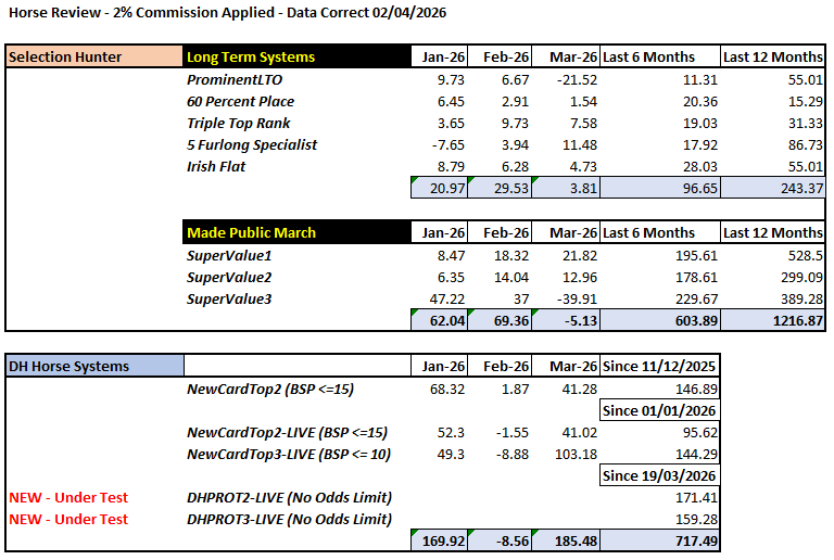 There are 3 additional systems that have been played live over the last 2 months and results continue to perform as expected. However these should be treated with caution as these are longer odds systems with low strike rates.  These have been made public as SuperValue1,2 and 3. There was a 88 BSP win yesterday – 02/04/2026 for SuperValue1 – not included in the results!