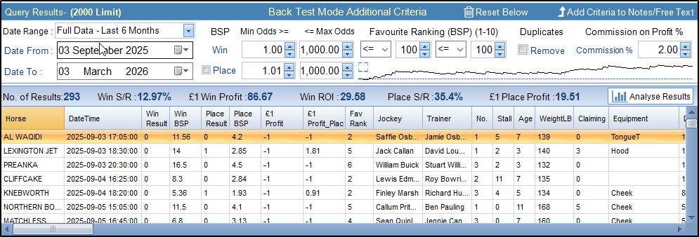 We can see the Places Results and Strike Rate by pressing the Analyse Query Results Button.