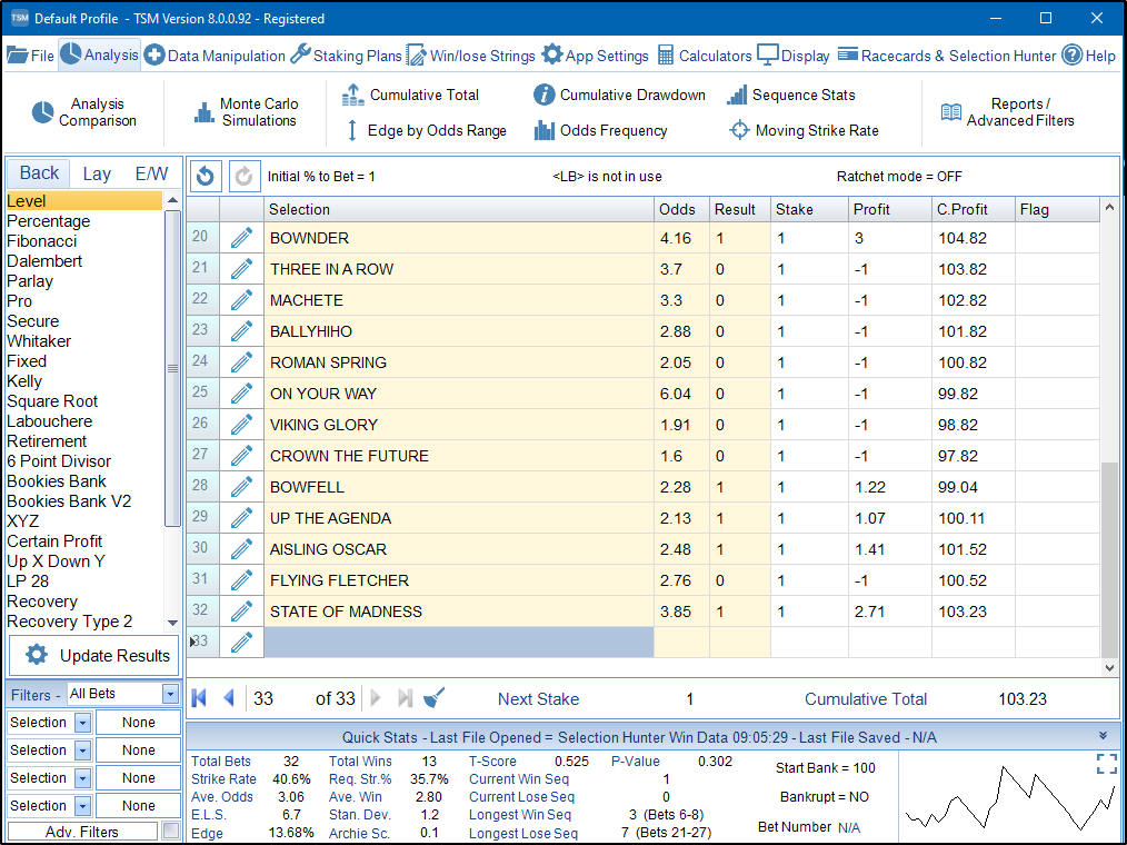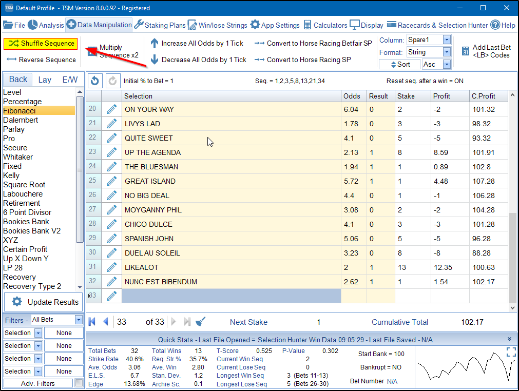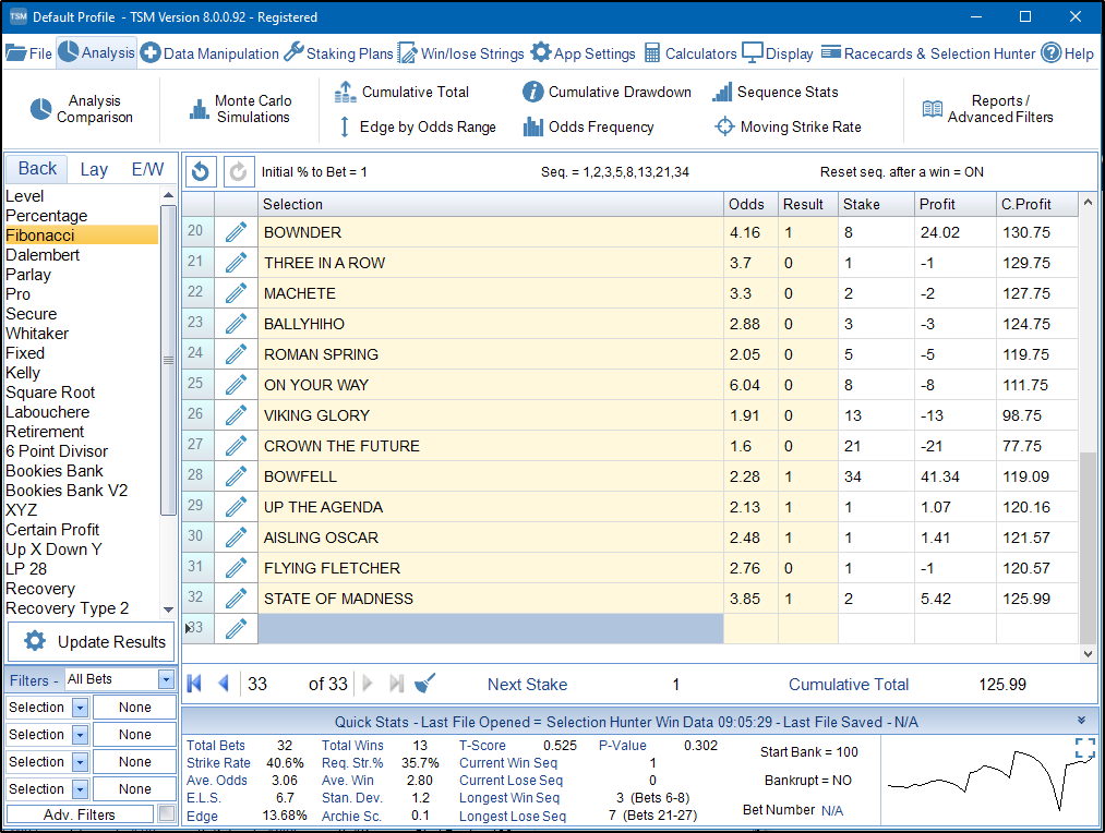 Scenario – You have imported your historical data. It shows a profit to Level Stakes. You start exploring alternative staking plans. As you review them, you notice the Fibonacci Staking Plan gives you a huge profit.