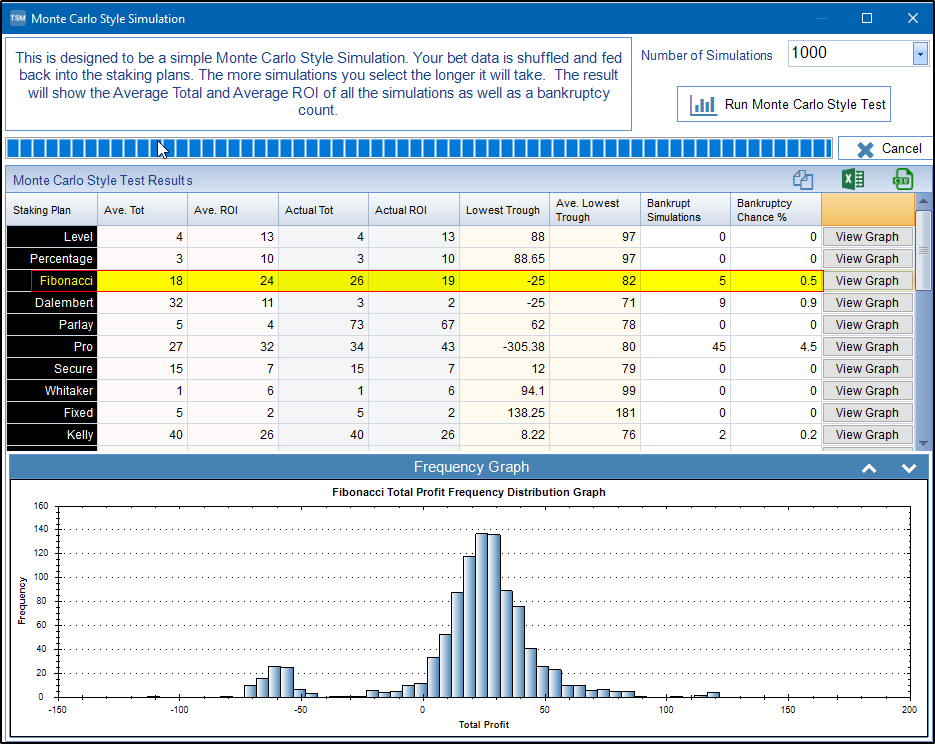 This confirms that the order of the bets can play a massive part in your profits. Let’s put our data through the Monte Carlo Simulation whilst we are here.